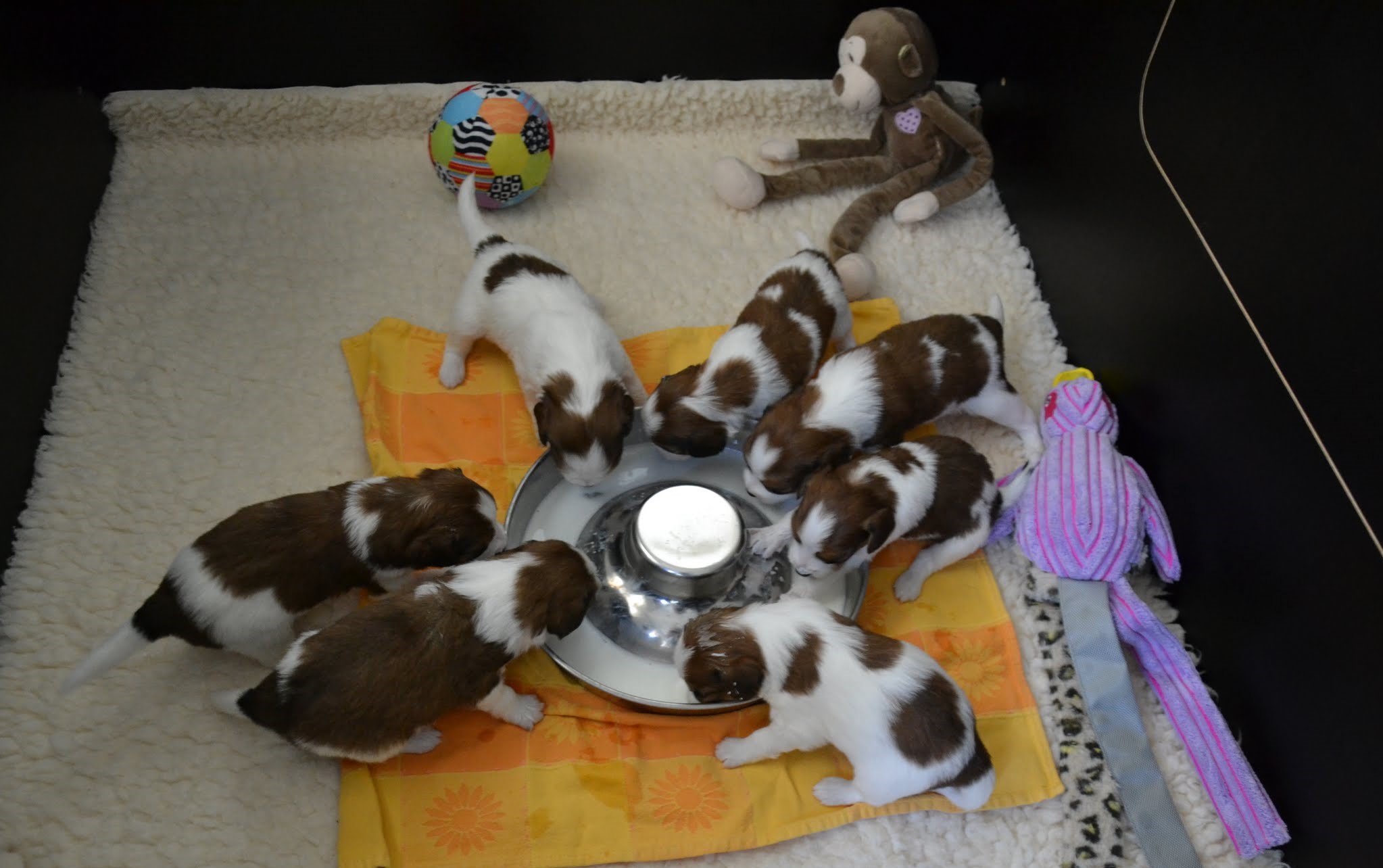 Met ongeveer drie weken krijgen de pups voor het eerst een beetje melk, dit vinden ze heerlijk! Daarna weken we een beetje vlees en brokjes in de melk om ze langzaam te laten wennen aan vast voedsel. Zodra ze klaar zijn met eten, komt mama om alle snuitjes schoon te likken :)