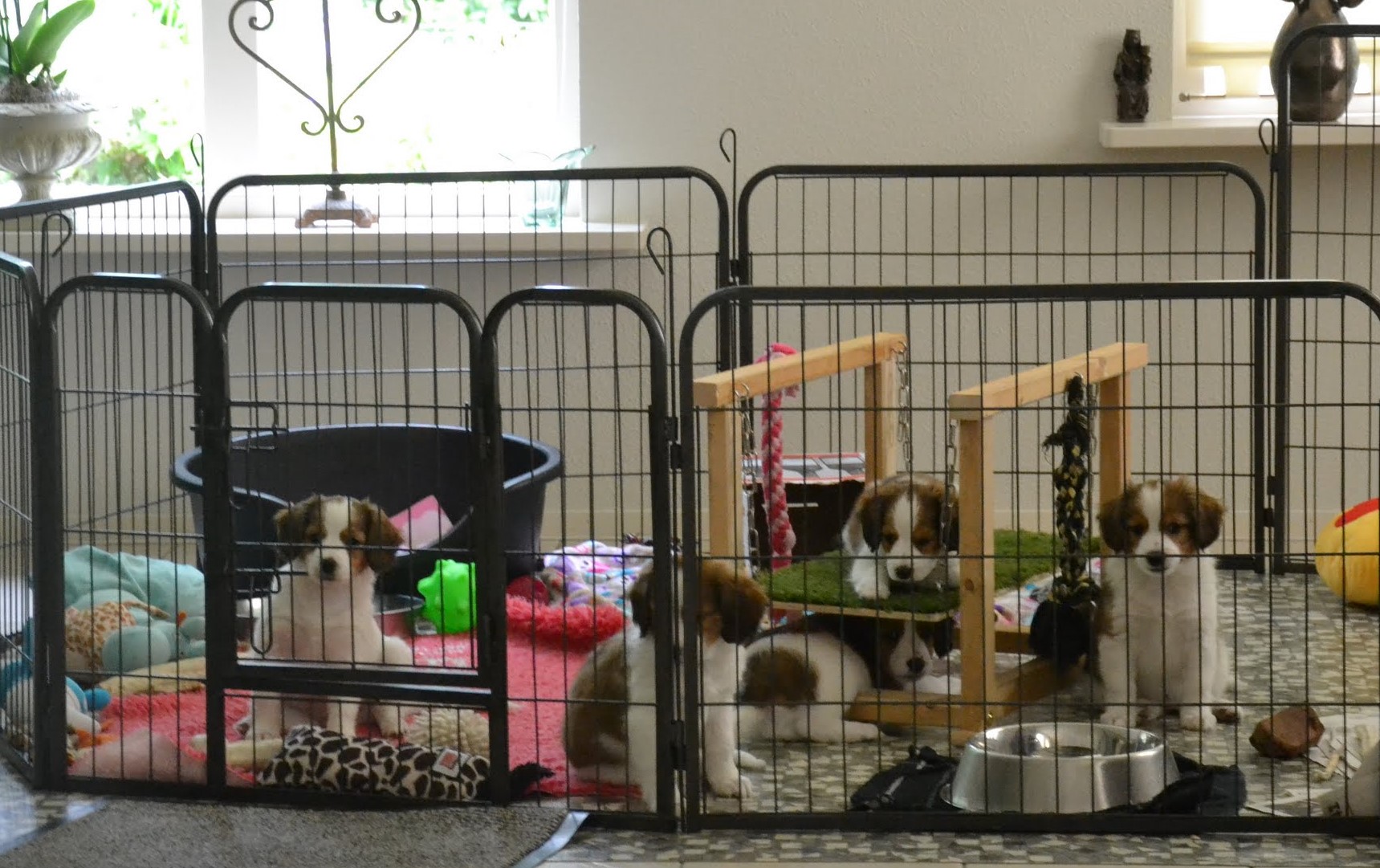Zodra de pups groot genoeg zijn om uit de werpkist te lopen, zetten wij er een ren omheen. Hier leggen we in een aparte hoek kranten neer, zodat de pups al een beetje leren om zindelijk te worden.