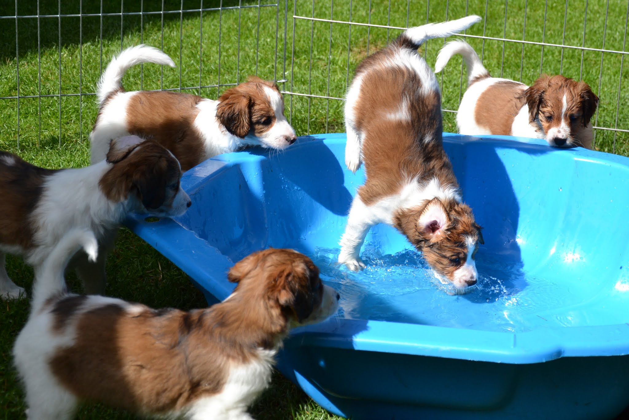Naast allerlei leuke speeltjes en speeltoestellen zetten we met mooi weer een grote schelp met een laagje water in de tuin. Zo weten de pups al gauw wat 'spetterpret' is.